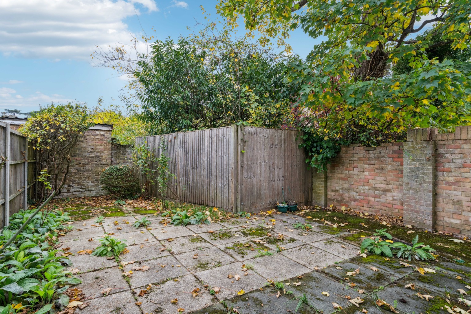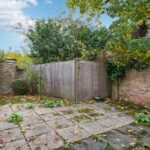 Outside, the rear garden is very private and laid mainly to patio — ideal as a low maintenance lock-up-and-leave and perfect for entertaining, framed by tall mature trees. The neighbouring property demonstrates how this space could be attractively landscaped to redesign the garden further if wished.