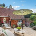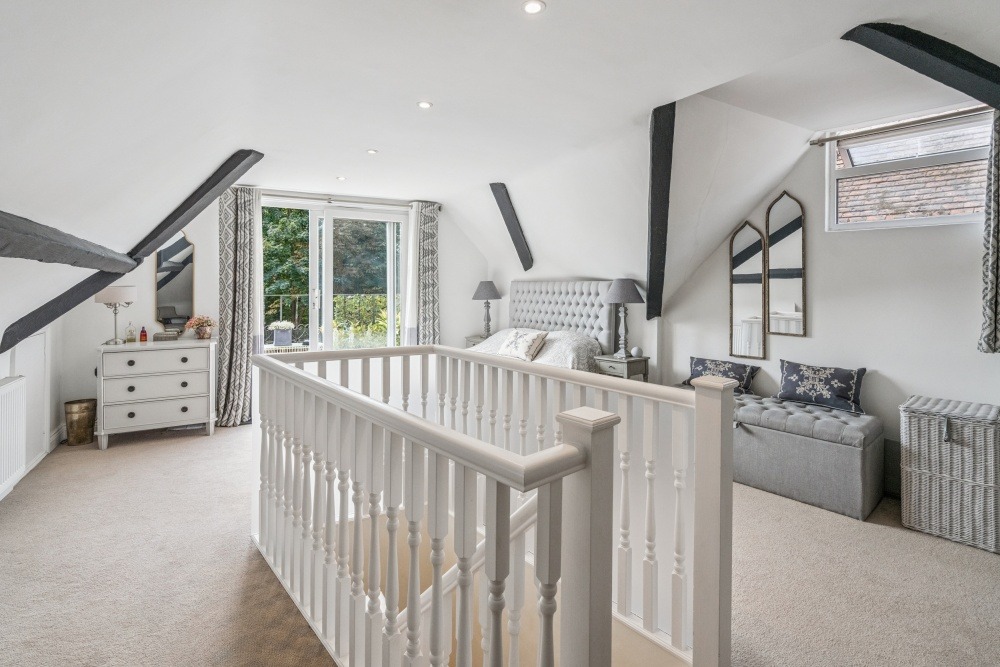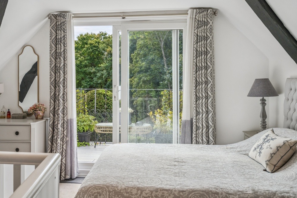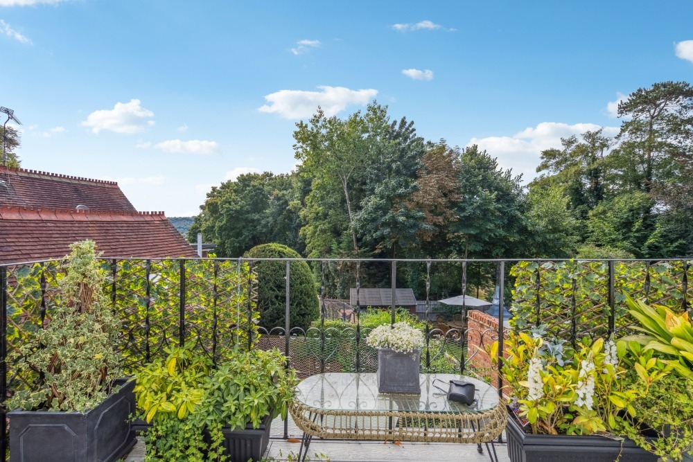 From the private parking in the courtyard the front door of Hill Cottage leads into the spacious hall with access to all the principal rooms including the reception room, open plan kitchen/dining room, second bedroom, bathroom and stairs to the impressive master bedroom. The reception room has a leaded light window to the front aspect. The open plan kitchen/dining room has been redesigned and refurbished with excellent attention to detail including new flooring throughout, and it has a wonderful double aspect space. The bespoke kitchen has a range of integrated appliances including fridge/freezer, oven, hob and dishwasher, with new granite worktops. The room is large enough for a large table and multiple chairs. French doors to the side lead onto the private courtyard style garden. The second bedroom is on the ground floor and is a generous size and could also be utilised as an office space. The re-fitted bathroom completes the downstairs space. To the first floor is a spacious light and airy main bedroom, full of character, with sliding doors providing access to the south facing balcony with far reaching views towards Marlow and the surrounding countryside. There is also space for additional storage cupboards into the eave space.