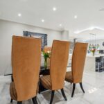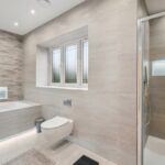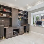 The 32 ft sitting room provides an ideal setting for entertaining, complemented by a modern kitchen featuring quartz worktops, a cooker tap, and sleek cabinetry. A study, additional reception room, and a stylish cloakroom complete the ground floor.