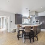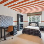 The feature kitchen/breakfast room is fitted with contemporary floor and wall units and extensive work surfaces, complemented by an adjacent utility room with matching cabinetry and space for laundry appliances. Upstairs, a grand galleried landing leads to five generous double bedrooms, all with built-in wardrobes and air conditioning. The master suite features a dressing area, double-aspect bedroom, and en suite bathroom, while the second bedroom also enjoys an en suite, alongside a well-appointed family bathroom.