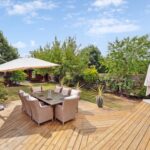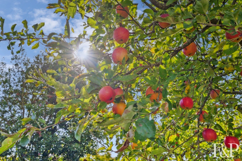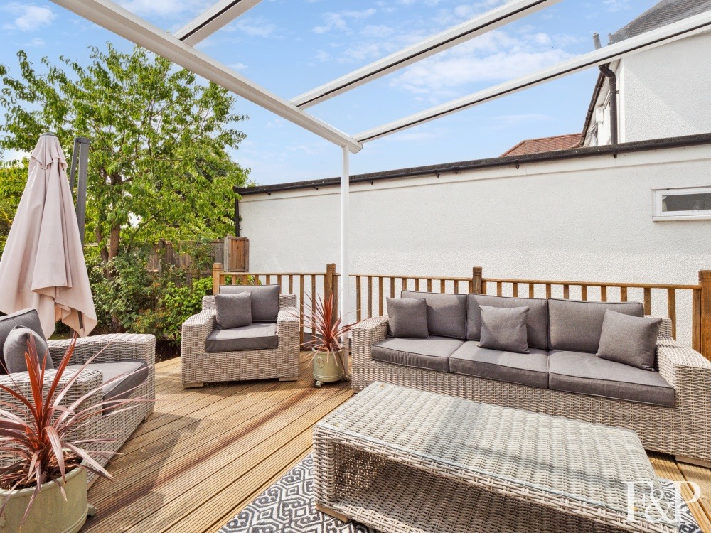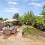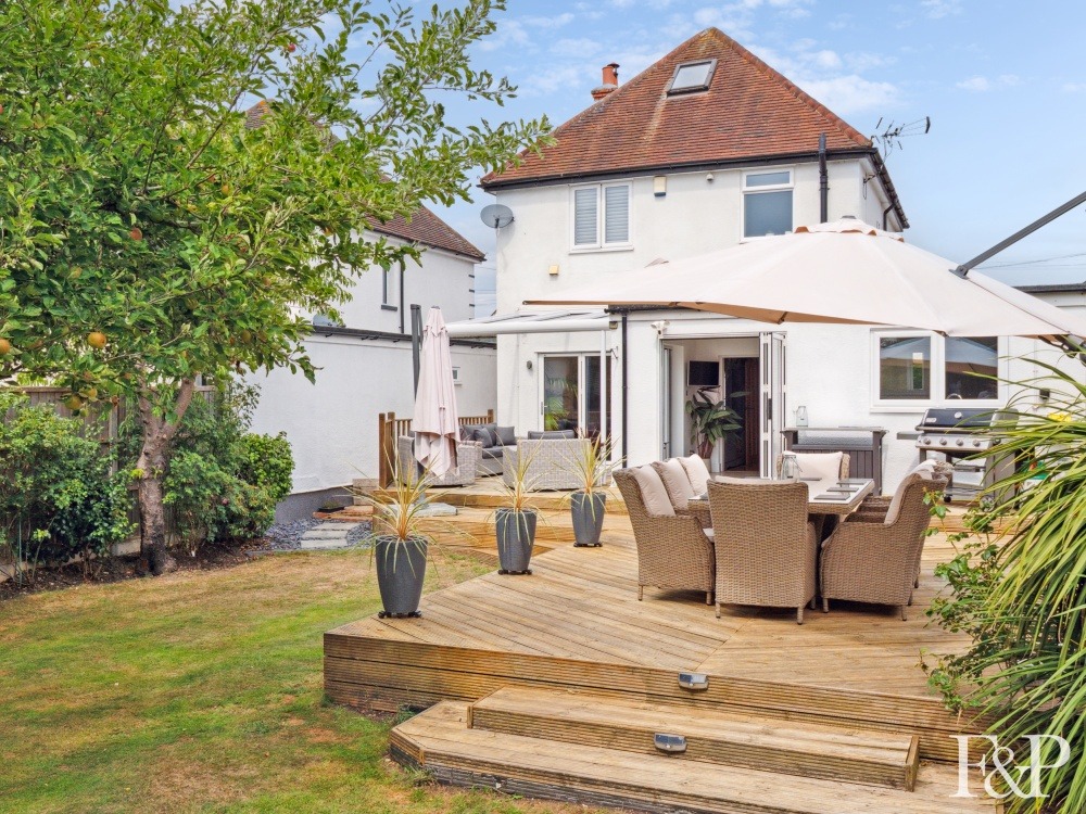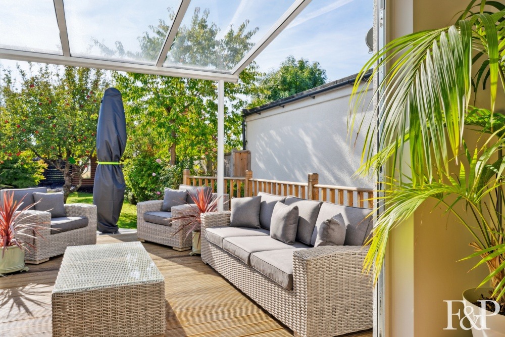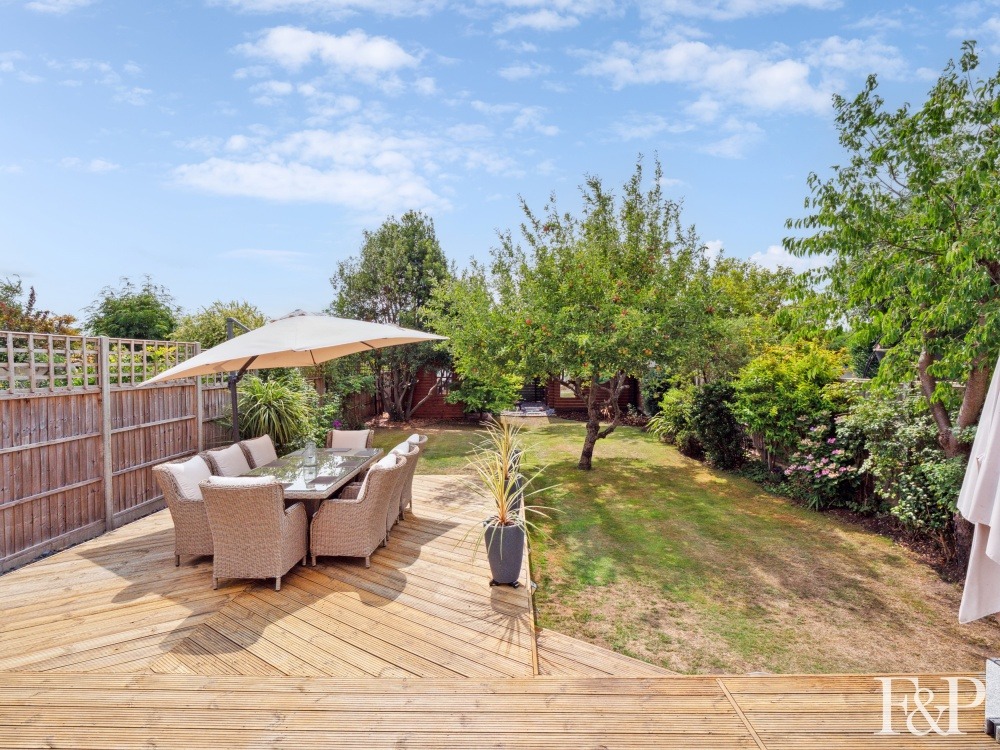 The rear garden is a private and serene retreat, backing onto council-owned nature reserve land. A generous decked area offers the ideal space for entertaining or unwinding, while the lawn is bordered by mature planting including flowering shrubs and apple trees, creating a peaceful and picturesque setting.
