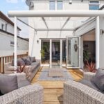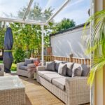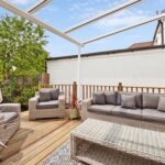 To the left, a flexible room currently arranged as a fourth bedroom presents an ideal space for a home office or additional reception room. To the right, the formal sitting room exudes warmth and sophistication, featuring engineered oak flooring, built-in surround sound speakers, and a statement Hwam log burner. This beautifully proportioned, double-length room opens through premium bi-fold doors onto a decked terrace, complete with a stylish glass-covered pergola – the perfect setting for al fresco dining or relaxed summer evenings, overlooking a tranquil and private rear garden.