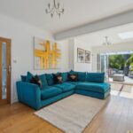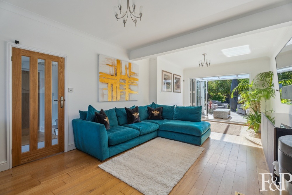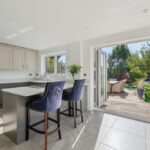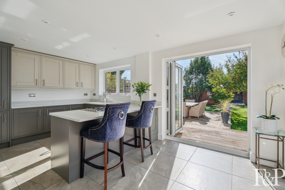At the heart of the home lies a bespoke Magnet kitchen/breakfast room, with two sets of bi-folding doors the kitchen has been thoughtfully designed and fully equipped with high-specification appliances including a Fisher & Paykel five-burner hob and double oven, Corian worktops, a Neff integrated dishwasher, and Samsung fridge-freezer. A Blanco sink and contemporary fittings add to the refined aesthetic, while plentiful storage is offered via a range of eye-level and base units. A secluded pantry and adjacent dining room further enhance the flexibility of the ground floor.