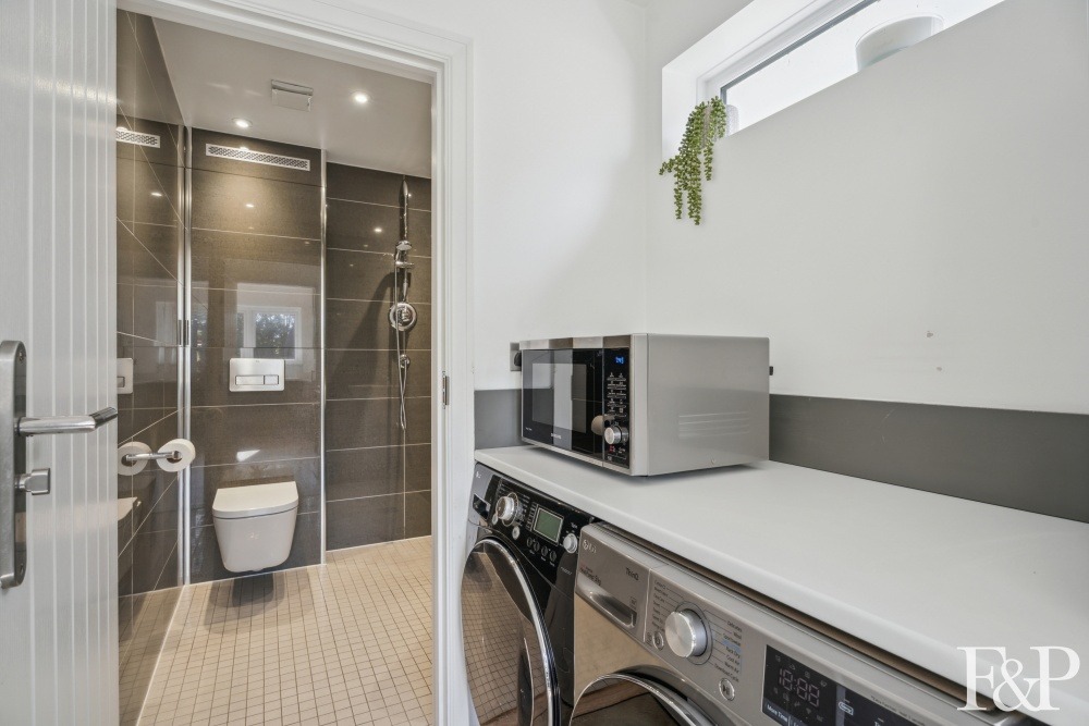 The kitchen leads to a well-appointed utility room and a modern wet room, complete with Aqualisa shower and a sleek Roca suite.