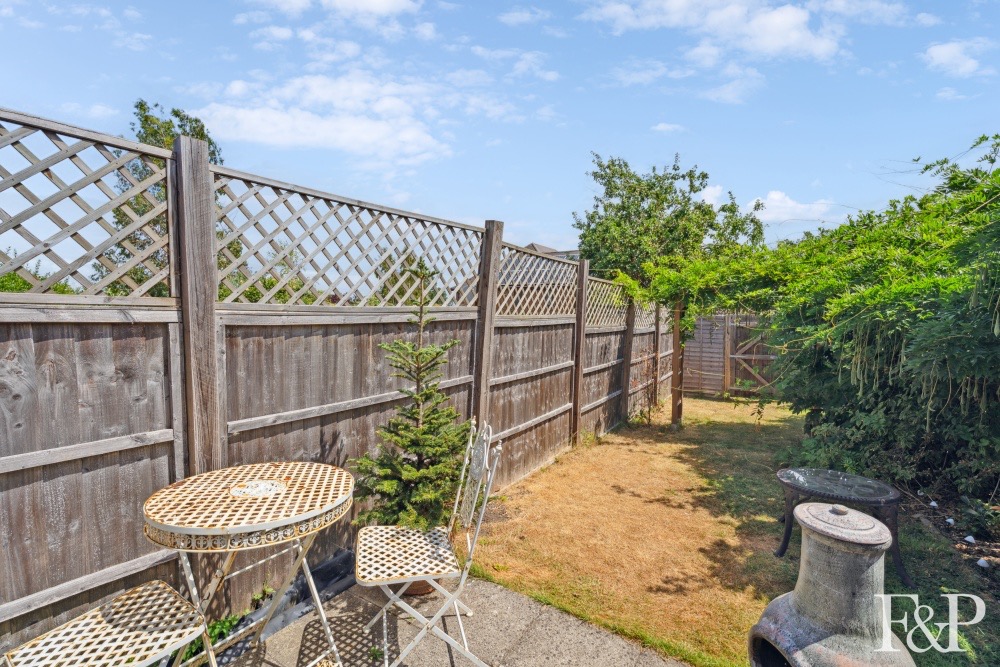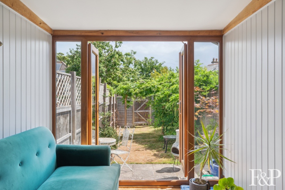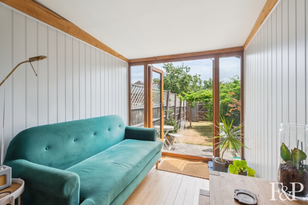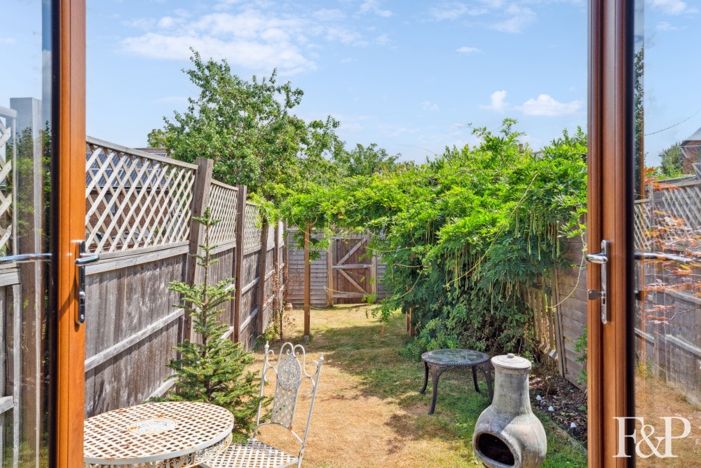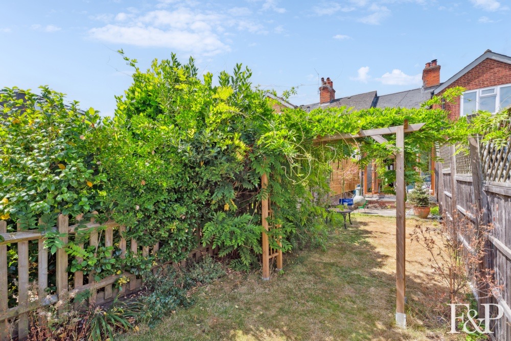 Double patio doors open onto the first of two garden spaces. The initial garden includes a paved seating area, neat lawn, and a striking purple wisteria arch. A gates leads through to a second garden, an unexpectedly generous outdoor space ideal for entertaining, relaxing or cultivating a vegetable patch. Private and rare for this style of home, the garden is a standout feature of this property.