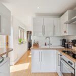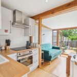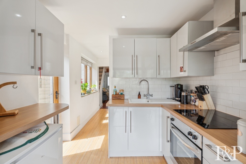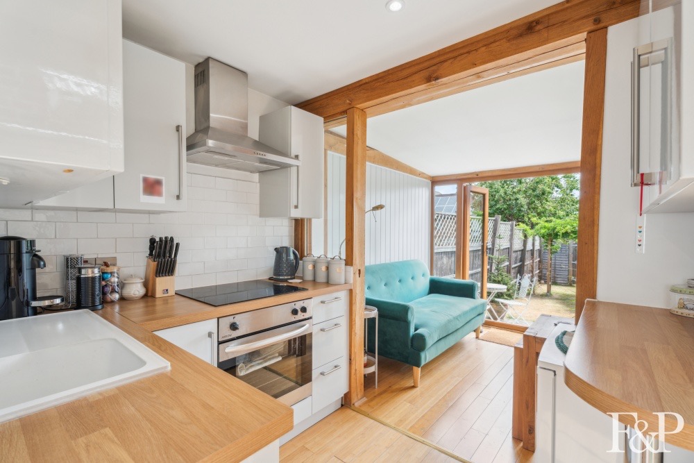 Inside, the cosy lounge showcases original features including herringbone wood flooring, oak beams and a log burning stove, perfect for quiet evenings at home. A generous utility and storage cupboard sits conveniently off the hallway, leading to a bright, well equipped kitchen with ample storage. The rear of the property has been thoughtfully extended, providing versatile space that could function as a snug, dining area, or be integrated into the kitchen to create a larger open plan layout with room for seating.
