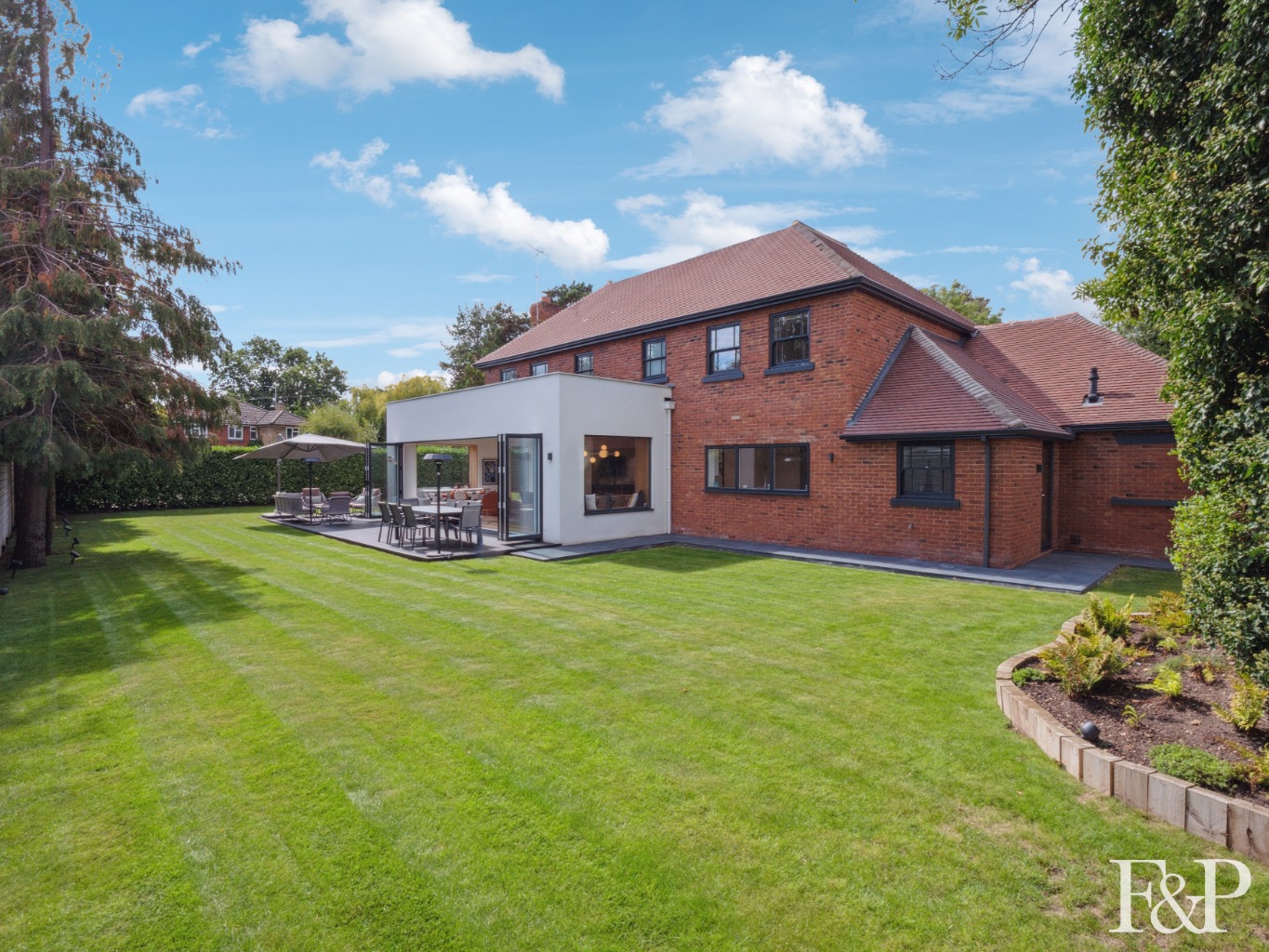 Situated on a generous plot, the home includes spacious entrance hall, drawing room, separate dining room, study, expansive kitchen/breakfast/family room, utility room, and cloakroom.