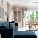 Inside, the entrance hallway leads to a study, separate dining room, playroom or snug, and a spacious sitting room with French doors to the garden and a feature fireplace. The ground floor has underfloor heating, and the upper floors have gas-heated radiators.